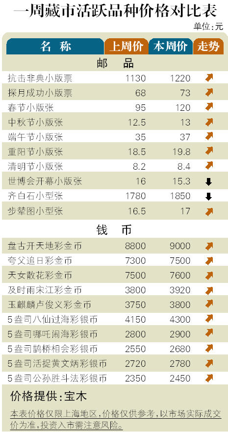 近一周市场热点有所转移,JT票再度盘旋,纸币热度下降,而近期缩量邮票受追捧,彩金银币涨势则更明显。