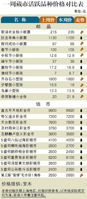 币市方面:彩金银币跌势趋缓,但止跌信号尚未出现。第三版人民币继续攀升,“背绿”一角纸币有水印价格扬升到31500元,“红一角”上涨到3950元,二元面值“古币”水印纸币价格回升至1390元。