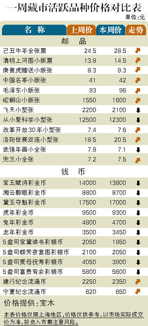 邮市方面:小版张整体上涨,“古桥”已涨升到325元,并带动其它品种联袂扬升,其中第三轮生肖版张表现突出,大多数品种一周涨幅均在15%以上。此外,“改革开放”双连小型张攀升到23元,升幅接近3成。不过,因连续20天上涨,8月初多数品种有短线回调迹象。