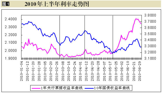 编者按:2010年上半年,国内债券市场不仅受到国内诸多因素的冲击,也受到海外困局的影响,形势复杂多变。中长端利率在宏观经济由强转弱中振荡回落,短期利率在公开市场带动下稳步上行并时点性冲高,利率曲线平坦化趋势显著。信用债继续维持去年年底以来的强势,上涨行情从2009年10月延续至2010年5月,信用债收益率曲线的形态整体呈现以1 年为轴的平坦化,各信用评级之间的利差收窄。下半年债券市场面临的国内外形势更加复杂,需密切关注政策风险和资金面变化,信用产品有可能再次成为新的亮点。