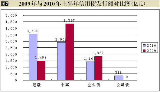 相对于利率产品的有涨有跌,信用产品一直维持2009年底的强劲涨势,从年初至4月中旬房地产政策出台之前,信用债涨势迅猛,信用利差明显缩窄。5 年期AAA中期票据收益率下降32BP,3 年期中票收益率下降了43BP,其他评级品种下降幅度更大。此波上涨行情主要是对利差的大幅修复,去年信用债收益率高企,信用利差较大,宏观经济面的好转、信贷政策的调整等多方面原因导致信用利差大幅回落。另外,如前面所述,充裕的资金面加大了银行、保险等投资类机构的配置需求,资本市场的低迷使得理财产品资金、券商自营资金大量涌入债市,而这些资金更偏好于配置信用债,进一步增加了市场对信用债的需求。供给方面,2010年上半年信用债总体供给略微增加,但主要体现在短期融资券的增长,中期票据发行量却大幅缩小,整体来看供给略显不足。(如图2)