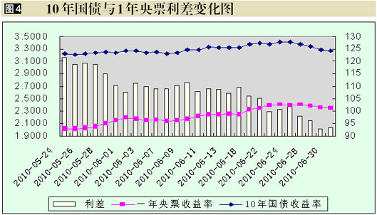 5月下旬至6月底,短期利率品种受资金影响大幅抬升,长期利率则在资金面利空和基本面利好的双重影响下小幅震荡。10年国债与1年央票利差由122bp下降到93bp(如图4)。