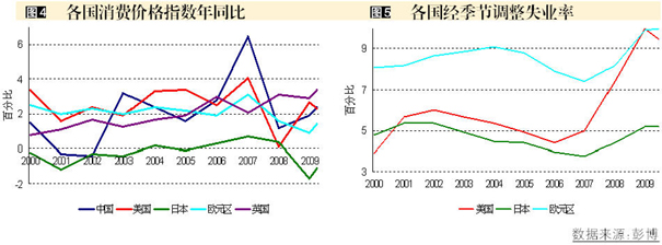 从各项经济指标来看,世界经济在2010年基本趋于稳定。各国在经济危机爆发之后的宽松货币政策基本没有结束(见图 2),基本确定了刺激措施退出尚早的基调;各国GDP增速从2008年以来继续上升(见图 3),经济势头良好;消费者价格指数也大都向好(见图 4),失业率也基本结束了攀升态势(见图 5),开始出现稳定迹象。总体上,在债务危机的影响下,世界经济复苏虽有所放缓,但整体趋于稳定。