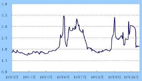 债券市场:虽然资金面相对宽松,但投资者担忧9月CPI依然高企,多空双方陷入胶着,收益率窄幅震荡