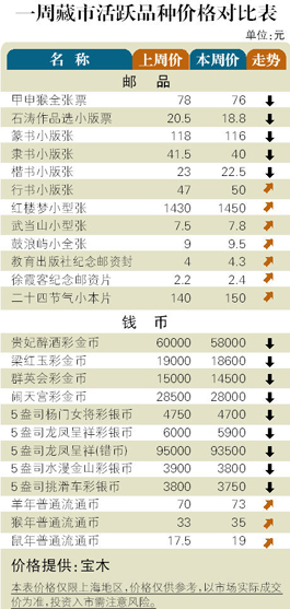 邮币市场在过去一周现盘桓,大多数强势品种冲高意愿不强,但低价品种却继续补涨,其中编年小型张和纪念流通币较明显。邮市方面:近期新邮处于箱体波动之中,价格变化范围在10%以内。而JT票成交继续活跃,其中“庚申猴”邮票创出9500元新高,“古代文学家”、“齐白石”、“工艺美术”、“当代美术”套票分别上扬到68元、320元、70元和4元。币市方面:彩金银币略有回调,但幅度不足5%。上周市场焦点集中在新面世的“辛卯兔”贵金属币上,本周初小规格的“辛卯兔”本色金银币和彩金银币分别在3300元和5200元附近有交易,惟市场对高开表现颇谨慎。