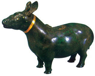 尊是古代的一种酒器,牺尊是牺牛造型的酒器。此尊背部有盖,可以打开合上,口部有流孔,可以把酒倒出来。牺尊的粗脖子上镶了一圈金环带,眉眼嵌有松绿石和孔雀石,通体饰有斜角云纹,还有金银镶嵌。牺尊的体形圆浑,细致生动,有如一尊神兽。这种造型精美的动物形酒尊,传世极为少见。