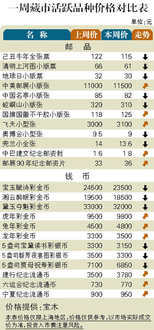临近年底,藏市调整仍未结束,大多数强势品种抗跌性显现。邮市:JT等“老邮”的调整基本结束,绝大多数品种呈盘桓状态,而近期新邮价格在下滑15%后已获得买盘支撑。本周初,“红楼梦”和“从小爱科学”小型张分别上扬,而生肖版张中的“庚辰龙”、“辛巳蛇”和“庚午马”全张票分别上涨。币市:金银币市场持续阴跌,“辛卯兔”货源涌出,本色金银套币和彩色金银套币分别回落到4200元和5400元,而5盎司彩银币也下沉至15500元。流通纪念币中的“牛年”、“鼠年”、“鸡年”和“猴年”则分别攀升到13元、28.5元、32元和43元。