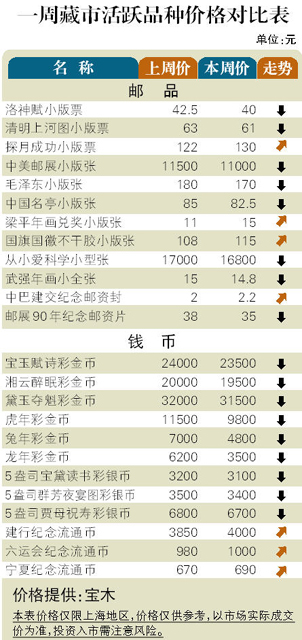 三九严寒的1月中旬,市场人气依然旺盛。虽然前期热点品种继续调整,但新的热点仍层出不穷,令成交维持活跃状态。邮市:“辛卯兔”邮票高位运行,全张票和小版张的价格盘桓在68元和35元附近。而上周热点聚焦在兑奖小版张上,“桃花坞年画”、“绵竹年画”、“朱仙镇年画”、“漳州年画”和“杨家埠年画”兑奖小版张则分别快速补涨至43元、22.5元、15.5元、25元和223元,这些品种半个月来价格翻番。币市:金银币价格盘旋,调整延续,市场观望气氛浓重。不过,生肖贺岁流通币表现不俗,本周初“羊年”、“猴年”、“鸡年”、“狗年”、“猪年”、“鼠年”、“牛年”和“虎年”市价分别微涨到115元、46元、34元、33元、32元、29.5元、13元和12元。