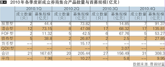 本季度成立数量大幅上涨的同时,募集规模也明显增加,为1442.30亿元,环比增长51.30%;新基金的密集发行一定程度上可以弥补存量基金资产的减少。虽然在数量和总募集规模上创出新高,但是基金的平均规模为22.89亿元,环比减少4.37%,而上一季度环比为增加75.90%。从具体类型看,36只股票基金共募集人民币611.10亿元,平均每只募集16.98亿元,较上月增加3.41亿元左右;4只混合基金募集166.58亿元,平均每只募集41.64亿元,较上月的平均规模增加0.71亿元; 21只债券基金共募集543.96亿元,平均募集25.90亿元,相比上月减少21.64亿元,债券型基金单只募集规模明显下降也与四季度以来债券市场受经济回升基础加强,央行加息影响而看空情绪浓厚影响而下跌有关;2只货币基金共募120.65亿元,平均募集60.33亿元。(表3)