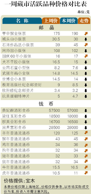 邮市:近期热邮在春节前止跌回稳,不少品种重新攀升,春节期间“梅兰竹菊”小版张和无齿小版张分别上扬到50元和350元,第三轮生肖版张也非常活跃,而双连小型张中的“洛阳世展”、“改革开放”和“邮联六大”分别回升至70元、52元和31元附近。