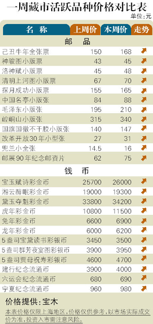 元宵节前夕,市场出摊率回至正常状态,由于市场热点不断,成交格外火爆,令不少邮商“提前”赶回市场上班。邮市:第三轮生肖版张振荡上扬,呈你追我赶创新高形态,本周初“乙酉鸡”、“庚寅虎”和“辛卯兔”全张票分别创出102元、88元和94元新高,。此外,一些低价品种补涨,其中“邮政110年(会员)”小版张扬升到20元,而小型张中的“香格里拉”和“洛阳世展”分别上攀至12.5元和24元。币市:金银币小幅反弹,但成交并不活跃,短期整固格局延续。纪念流通币中的生肖品种上扬,其中“羊年”走高到140元,“虎年”攀升至17.5元,而“海宝”流通币上涨到10元附近。
