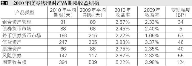 从不同投资类型产品的期限收益结构来看,普通类人民币理财产品中,固定收益权类产品的期限最长、预期收益最高,信贷资产类产品次之,票据类产品的投资期限最短,外币债券货币市场类产品的平均预期收益率最低。2010年主要投资类型产品的预期收益率均高于2009年的评价预期收益率。固定收益类产品的平均委托期限为394天,相比2009年度大幅缩短,平均预期收益率为5.22%,上升124个BP。信贷类产品的平均委托期限为247天,与2009年相比延长42天,平均预期收益率为3.83%,环比上升46个BP。外币债券货币市场类产品的平均委托期限为193天,与2009年相比缩短22天,平均预期收益率为2.22%,环比上升57个BP。风险债券类产品的平均委托期限为147天,环比延长30天,平均预期收益率为2.87%,环比上升55个BP。组合资产管理类产品的平均委托期限为91天,环比延长2天,平均预期收益率为2.67%,环比上升34个BP。债券货币市场类产品的平均委托期限为88天,环比延长20天,平均预期收益率为2.45%,环比上升5个BP。票据类产品的平均委托期限为66天,环比缩短22天,平均预期收益率为2.75%,环比上升40个BP。(表1)