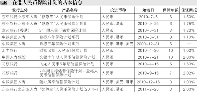 2009年底,中银集团人寿发行首款人民币保险计划“目标五年保险计划系列”,而后各家金融机构也相继推出兼具储蓄功能的保险计划。截至2010年2月底,市场上共发行人民币保险计划11款。(表2)