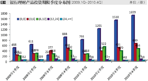 2010年,全年银行理财产品投资期限呈现短期化趋势。从理财产品投资期限占比来看,在2010年,3个月(含)以内的理财产品占比为60%,较2009年大幅增加17个百分点;3-6个月(含)与6-12个月(含)产品占比与2009年情况相比有所下降,2010年度占比为17%和20%;1年期以上理财产品占比仅为3%,与2009年度相比下降2个百分点。自从全球金融危机爆发以来,银行理财产品投资短期化趋势便有所显现并且逐月加强,2010年银行理财产品的期限分布趋于稳定。短期化产品的类型不断丰富,如周末理财产品、假日理财产品以及特点人群节日理财产品等。进入2010年第4季度,欧洲主权债务危机、国内通胀预期以及人民币汇率、利率“双升”背景下,银行理财产品的投资期限再次呈现缩短趋势,短期限产品受到青睐。(图6、7、8)