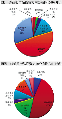 从理财产品的投资方向来看,2010年银行理财产品投资方向主要集中在组合资产管理类和债券货币市场类产品,外币债券类产品位居第三。2010年普通类与结构类银行理财产品的投资方向占比情况参见(图9、10)。