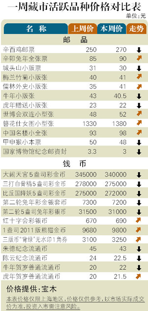 4月初的藏市表现稳健,热点维持3月下旬状态,其中新邮依然振荡,上下反复频繁,而市场上“产品票”已变得炙手可热,人物题材票十分抢手。邮市:热点新邮振幅收窄,成交也有所萎缩,但过去一周绝大多数品种的底部呈抬高趋势。JT小型张继续走强,其中“三国(1)”、“水浒(1)”和“敦煌(1)”小型张联袂攀升至175元,“梅花”小型张走高到290元。币市:国际金银价格振荡频繁,但对市场影响有限,大多数品种表现稳定,涨跌幅度较小。纪念钞在3中旬快速飙升之后,4月初有所回调,其中“北京奥运会”纪念钞下滑到4700元附近,“双龙钞”跌至16000元。
