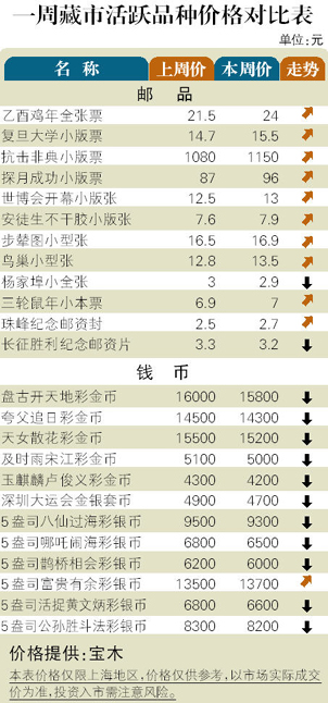 5月末,藏市整体表现活跃,邮市再度出现反弹,5月上旬的阶段性底部已若隐若现,但后市仍存反复可能。币市热点不多,不过银币的下滑暂时有告一段落迹象。邮市:上周初的抛压仅维持了2天,即遭遇买盘围剿,并形成上扬趋势。其中“甲申猴”全张票创出280元新高,“改革开放”和“洛阳世展”双连小型张攀升至67元和51元,“梁平年画”丝绸小版张和兑奖小版张分别上涨到21.5元和13元。币市:银币有所企稳,其中2011版1盎司“熊猫”银币在325元附近盘旋,藏家较一周前回调5.8%。新品继续下沉寻找支撑,如“京剧脸谱(2)”、“上海造币厂(加字)”和“西安世园会(加字)”金银套币分别下挫至7300元、7900元和10500元附近。