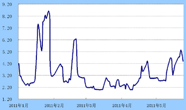 货币市场:前半周,回购利率连续攀升。周三,隔夜、7天和14天回购利率均超过5%。之后资金供给增加,资金面有所好转,7天回购利率回落至4.39%