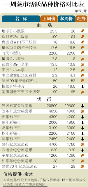 南方的梅雨带不期而至,传统的邮市“歇夏期”也按时来临。从近一周市场表现看,币市陷入调整,成交不断萎缩,歇夏之意渐浓。而邮市活跃程度增大,对“歇夏期”仿佛不理不睬,个别品种则创新高。邮市:“甲申猴”全张票短暂回调后,本周初再创320元新高,由此第三轮生肖版张整体逞强,其中“丁亥猪”、“己丑牛”、“庚寅虎”和“辛卯兔”全张票分别攀高至80元、195元、86元和83元。“辛卯兔”小版张扬升到34元,一周涨幅逾2成。币市:彩金银币均有小幅回落,但跌幅并不大。而与国际银价存差距的2011版1盎司“熊猫”银币继续阴跌,本周初已下滑到300元附近,成交仍不佳。近期发行的几款“熊猫”加字金银套币,因买气不足价格逐日下沉。