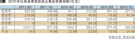 因基金成立数量出现大幅提升,募集规模也出现大幅提升,为1247.13亿元,环比增加43.14%。其中,股票型、混合型和债券型分别募集507.82亿元、219.88亿元和519.43亿元,较上季度均明显增加。然而,基金公司的发行热情与投资者的购买热情并非完全一致,平均规模继续回落,为14.50亿元,环比减少6.81%。原因有二:首先,今年以来,监管当局对基金发行的管理放松,使得基金发行数量激增,但是由于市场低迷,投资者的投资需求与基金发行的速度不成正比;其次,今年市场资金面相对紧张,银行方面资金紧张,银行拆借利率也水涨船高,而作为基金销售的主要渠道的银行把重点放在锁紧流动性方面,集中精力在银行理财产品以及存款业务,基金的销售动力相对减少。(表4)
