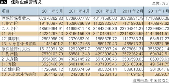 2011年的保费收入要根据《保险合同相关会计处理规定》进行调整,而根据该会计处理,投资连结险和万能险所产生的保费收入大部分都不能计入保费收入,导致2011年和2010年的统计口径产生不一致,所以无法计算同比增幅 。但根据中国保险监督委员会公布的保险业经营数据依旧可以看出,2011年前5个月的保费收入依旧保持往年的增长规律,逐月递增。与此同时,原保险赔付支出也保持同比增长。