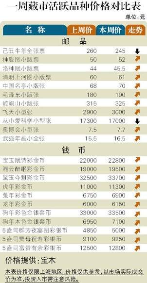 7月最后一周,藏市出现较大波动,其中邮市受第三轮生肖版张上蹿下跳影响,振荡激烈。金银币则开始缓步回升,有试探性投资买盘介入迹象。邮市:市场热点基本围绕“甲申猴”全张票展开,该张上周一度下挫到620元,本周初价格回升至760元附近,振幅不小。双连小型张中的“洛阳世展”继续创新高,本周已摸高至120元。币市:国际金银价格的再度上扬,令前期冷寂的市况死水微澜,市场热点闪现。其中“贵妃醉酒”彩金币上扬到65000元,“藏羚羊”银币飙升至1600元,10天内即现翻番。而第三版“红一角”券飙涨到8000元附近,“北京奥运”纪念钞也走高至6200元附近。