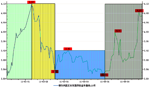 第三阶段(三月中下旬-5月下旬):物价压力依然较大,4月份年内第二次加息,但资金面继续缓解,以工业增加值为代表的宏观数据显示经济有放缓迹象,加之日本核危机的爆发推动避险情绪的回升,制约中长债收益率冲高,10年国债在3.82-3.92%区间窄幅徘徊(图4)