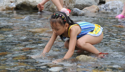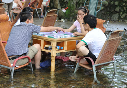 今年夏天,四川的天气每天在39-41度高温晃悠,周末是市民们最难熬的日子。寻找避暑圣地成了市民们的一大课题。位于四川绵阳市江油的养马峡小镇,聚集了来自不同城市的人们。养马峡两边的高山上植被茂盛,在市区温度39度时此处的温度也只有24度,从山上流下来的无污染山水,清晰透明,冰凉又干净,水给酷暑带来凉爽。你看,有在小溪中安起桌子打起了麻将的,有喝茶聊天的,有在小溪中玩水的……