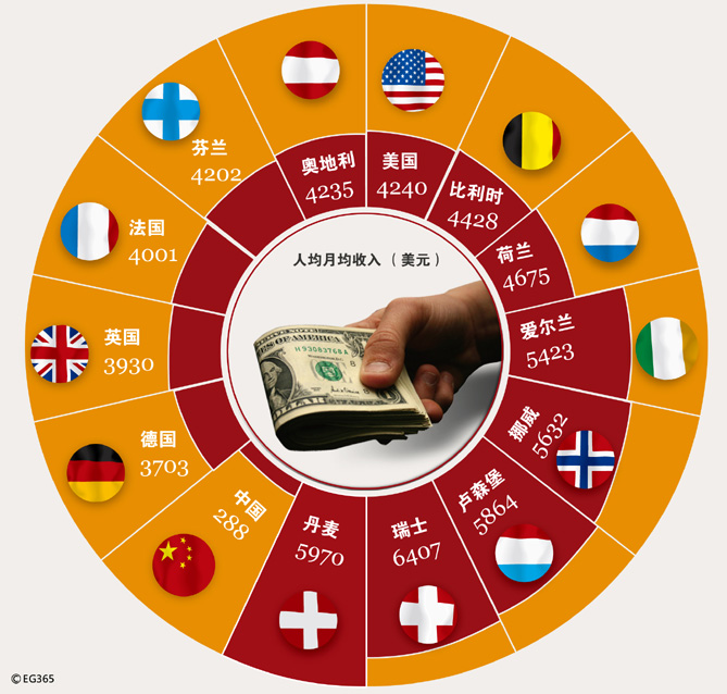 美国《商业内幕》日前对欧洲国家薪资水平展开一项调查,并列出了工资水平最高的20个国家。瑞士以人均月收入6407美元排在榜首,丹麦以5970美元排在第二位,英、法、德等欧洲大国人均月收入均在4000美元上下。根据联合国欧洲经济委员会的报告显示,美国人均月收入为4240美元,在欧洲工资水平最高的20个国家中位居中游。而据上半年统计局公布数据,中国城镇居民人均月可支配收入为1840元,折约288美元。图片作者:EG365/CFP