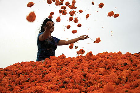 在从麦盖提县返回喀什的途中,我们偶遇岳普湖县的副县长,今年上半年,他几乎没有休息日,不是招商引资就是交流合作。听说我们是从北京来的记者,硬要拉我们去县里看看。岳普湖在喀什12个县市中属于小县,地处塔克拉玛干沙漠边缘。除了开发沙漠旅游之外,它们也建立了自己的工业园区。在那里,记者见到了令人难忘的景象。在半个标准泳池见方的水泥池子里,堆满了橙色的万寿菊。副县长告诉我,这是工业园里一家天然色素提炼加工厂的原料池,从万寿菊里能提炼出纯正天然的橙色色素。池中的工人正在翻花晾干,见到记者拍照,非常高兴,一位维族女工还很配合的摆出了“天女散花”的姿势让我们拍。副县长告诉记者,现在县里的农民不再只知道“面朝黄土背朝天”的干活了,由于家里人口众多,一部分劳力继续留在家里种地,另外一部分劳力则可以就近打工,改善生活。