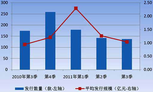 从基金首募规模来看,2011年三季度66只基金共募集资金518.49亿元,平均每只基金规模为7.86亿元。总体来看,今年基金发行市场呈现基金数量扩张“大年”、首发规模“小年”的状况。目前,规模在2亿-5亿元的“袖珍”基金遍地可寻,首募超过10亿元的已属“个中翘楚”。而在基金的高峰期2007年,平均首募规模达到70.22亿元,成立规模动辄上百亿,华夏全球精选发行首日便认购了620亿元,最后成立规模为300.56亿元。