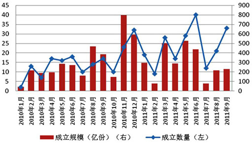 2011年三季度基金成立数量出现回落,共有66只产品成立,较上季度减少20只,减少幅度为23.25%。截至