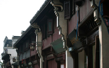 江苏高淳老街以略带徽派特色古典建筑而著称,街中的店铺一般都为楼宇式双层砖木结构,挑檐、斗拱、垛墙、横衍、镂窗齐全,造型别致。清晨空气清新,街上人很少,在房门口伫立的老人,行针走线的阿婆,坐在大人腿上剃头的小弟,有一声没一声吹喇叭的小妹,全然透出老街的静谧。老街店铺的招牌是另一道风景,一律黑底金字。倘徉在老街上,物我两忘,我成了老街的风景,老街装饰了我的梦。