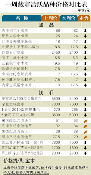 随着“无锡亚展”落幕,藏市复归活跃,市场人气恢复,但成交依然有限。由于整理格局未变,市场热点不多。邮市:新邮延续高开低走之态,“无锡亚展”无齿小型张快速下沉到78元,而小版张和小型张分别跌至10元和7.3元附近。此外,“关公”小型张下滑到16.5元,“绵竹年画”小全张跌至7元。币市:金银币市场迎来新品发行高潮,尤其是“壬辰龙”的亮相,无疑成为新热点。不过因发行量的放大,溢幅明显收敛,其中“壬辰龙”彩金银套币价格下滑到4400元,“壬辰龙”本色金银套币价格在3800元左右,5盎司“壬辰龙”彩银币跌幅最大,与面世初的9000元相比,跌幅高达24%。