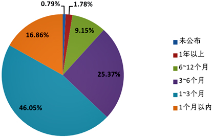 新发产品的期限本季度较上季度有较大的变化。本季度1个月及其以下产品仅发行879款,环比减少1177款,市场占比从三季度的35.35%急剧下跌至16.86%。1个月至3个月期理财产品出现大幅增长,发行量从上季度的1820款上涨至2401款,环比增长 31.92%,市场占比提升至46.05%。总体来看,3个月以下产品继续占据市场的绝大部分,市场占比超过60%。3个月至6个月期产品共发行1323款,环比增加103款。6个月期以上理财产品发行量继续呈现下行趋势,其中,6个月至1年期产品发行了477款,环比减少74款;1年期以上产品发行93款,环比减少75款。(图5)