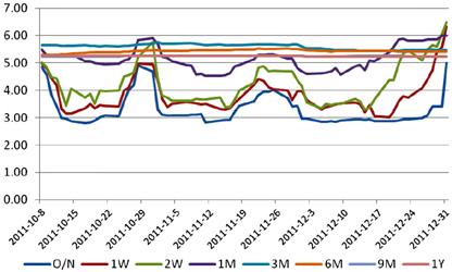 2010年以来连续 12次上调存款准备金率,使得货币乘数从2010 年一季度的4.35降至2011 年3季度的3.71,M2增速快速下降,银行吸储压力大增。而日均贷存比考核压力较大,存款增长乏力使得信贷供给大幅受限,而信贷需求依旧强劲,因而银行对资金的需求依旧紧张。但是,2011 年 11 月 30 日央行下调存款准备金率,扭转了自 2010 年以来提准、加息收缩流动性的政策方向,增加了银行体系的资金,有利于未来货币乘数的回升。另外,由于国内经济下滑风险加大,银监会推迟银行业新监管标准的实施,暂缓了银行的资本补充压力,银行在11份中旬以来,资金面逐步缓解。从SHIBOR走势来看,四季度SHIBOR走势相对平稳,但依旧是明显地以月度为周期上下波动,银行在月末冲时点的特征明显。(图7、图8)