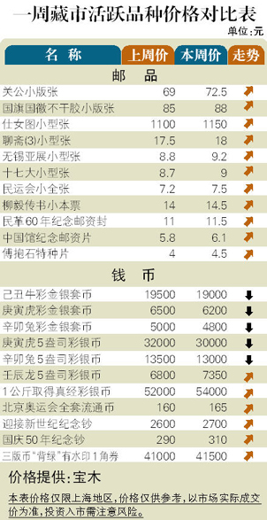 一度退潮的“中行百年”港钞炒作卷土重来,且在3月上旬增加了澳门的“中行百年”莲花钞,后者价格飞涨至3500元附近。邮市:热点品种涨多跌少,尽管“富春山居图”小版票在摸高210元后回调至190元附近,但“清明上河图”、“洛神赋图”和“神骏图”小版票却分别攀升到62元、48元和92元。此外,“改革开放”和“无锡亚展”双连张分别扬升到60元和51元。币市:“中行百年”港版纪念钞回升到1300元附近。而金银币再度沉寂,成交萎缩。其中“壬辰龙”彩金银套币和本色金银套币分别微挫到4050元和3700元,“壬辰龙”5盎司彩银币冲高回调至7350元。