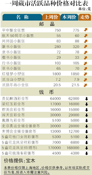 藏市在刚刚过去的一周内热度不减,尤其是邮市活跃度明显增大,显示出市场走强迹象隐现。邮市:热点品种表现依然撩眼,其中“壬辰龙”全张票和小版张一度创出440元和106元新高,“甲申猴”全张票也摸高到820元。虽然本周初有所回调,但具短暂回抽性质。此外,今年新邮均高开高走,特别是“中行百年”套票走高至14元,较面值纯溢幅接近5倍。币市:“中行百年”香港版和澳门版纪念钞价格高高在上,成交凝滞。金银币表现平平,“壬辰龙”金银币继续回调。不过,纪念流通币中的人物题材买气重现,像“宋庆龄”、“朱德”和“邓小平”分别回升到56元、40元和30元附近。