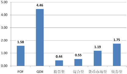 本季度受资金面牵动,以及基本面预期的改善,债券市场整体呈现震荡向上格局。受此影响,本季度仅有1款债券型产品为负收益,为平安年年红债券宝,收益为-0.09%。另外,受益于香港股票市场的回升,QDII产品实现平均收益4.46%,为表现最好的产品类型。货币型产品的平均收益为1.19%,继续维持稳定的正收益。(图4)