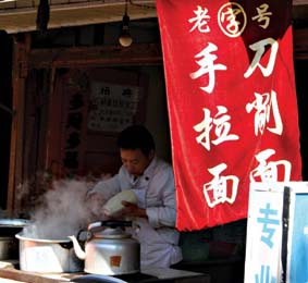 窄街上的行人渐渐多了。经过一个菜场,新鲜的蔬菜或堆放在地上的旧布单上,或在木头小车上。去吃“凉鸡米线”,一家不大的小铺,看上去很有些年头了,铺里整齐摆放着四方小桌和长凳,旧是旧了,却是整洁。粗碗盛着莹白的米线,撒些碎花生米和鸡丝,味道极好。咿呀咿呀的胡琴声隐约传来,悠闲的底子便露了出来。