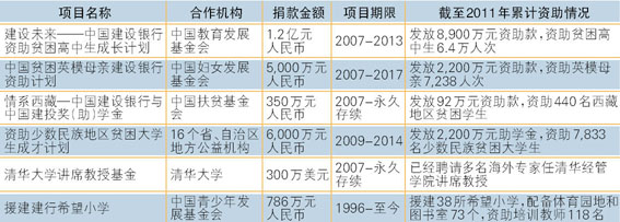 在支持公益事业方面,建行长期以来积极支持社会公益事业,2011年共实施了15个重要公益项目,捐赠总额0.47亿元。