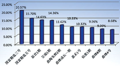 从公司看,国富与新价值两家私募公司本季度的业绩表现可谓冰火两重天:前者旗下6款产品的收益率均在15%以上,远远领先其他公司,而后者旗下29款产品的收益率全部为负,最低亏损0.31%,最高亏损18.81%,在可比阳光私募产品中集中垫底。不过,令人困惑的是,新价值曾在2009年小牛行情中迅速发展成最大的阳光私募之一,一度拥有众多拥趸,然而随着市场进入调整,新价值系的表现每况愈下,自本季度集中垫底,且产品单位净值除新价值2与新价值3外,其余产品的单位净值全在净值单位100以下。曾经闻名私募界的新价值现在是怎么了?是因为不可避免的系统性风险?还是自身操作策略问题?(图4)