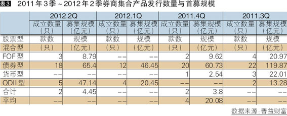 本季度券商集合理财产品发行反弹,共成立28款新品,较上季度的16款增加12只;首次募集规模125.78亿元,平均募集4.49亿元,投资者的热情也较上季有所好转。其中募集规模最高的是第一创业证券旗下的债券型产品——创金季享收益,只用了11天的推广期,募集资金28.28亿元,远超其他产品;募集规模最小的是银河证券旗下的货币型产品——水星2号,仅募集1.16亿元。(表3)
