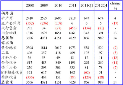 2012年第一季度全球黄金需求为989吨,较2011年同期上涨14%,需求价值同比增加16%,达597亿美元。伴随金价再创新高,黄金珠宝需求同比降低6%,实物黄金投资需求较上年有所下滑,但仍保持338吨的高位。供给方面,矿产金供给同比增长3%左右,而全球央行黄金减持自2009年3季度开始由正转负以来,这一趋势得以延续,2012年第一季度央行黄金需求量达到80.8吨,但净购买量同比下跌41%。