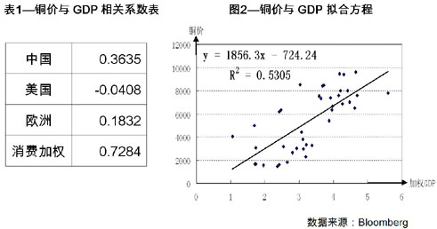 除中国外,另选取铜主要消费国:欧元区(20%)和美国(10%),以各国精铜消费占全球消费量的比例为权重,对这三个国家的GDP进行加权,经2002年6月至今数据检验,加权后GDP与LME3月期铜价格的相关性高达72.84%。以最小二乘法回归,得到线性方程y=1856.328x-724.243,其中y为LME3月期铜价格,x为加权后的GDP。