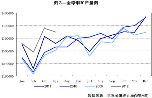 2011年全球铜精矿产量将达到1603.5万吨,较2010年下降6.5万吨或0.41%。而2012年随着新矿山投产、老矿山扩产,主要包括智利Esperanza铜矿正式投产,年产能在20万吨左右,巴西Salobo铜矿建成,一期年产能10万吨,另外墨西哥结束长期罢工的Cananea铜矿预计将恢复18万吨年产能,铜矿供给紧缺状况预计将得到缓解。根据ICSG预测,2012年精铜矿产量将较2011年增长7.47%达到1723.3万吨。