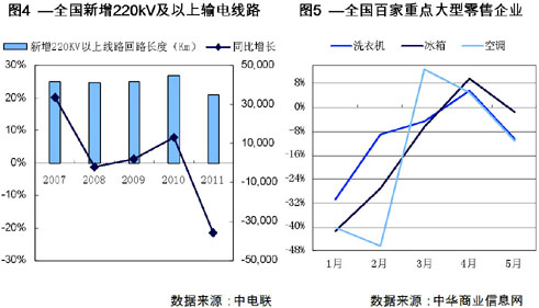 中国铜消费行业主要包括电力、家电、建筑和交通运输。其中,电线电缆行业是国内最大的铜消费领域,近年来对铜的消费量占国内铜消费总量近50%,2011年,全国基建新增220kV及以上输电线路长度3.51万千米,同比回落21.6%(见图4)。从历史数据看,多年来主电网输电线路新增长度首次出现如此明显的降幅,反映了我国主电网建设已出现明显减速迹象。