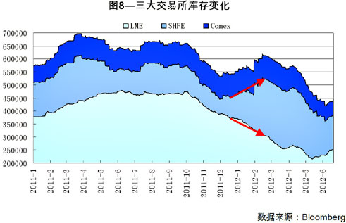 上半年伦铜走势基本与年初的展望相吻合,在年初的市场展望中,我们提出:(1)从时点上看,春季为铜的传统需求旺季,加上欧债危机有所缓和,美联储声明确定宽松货币政策,年初铜价料将有所反弹。(2)随欧元区债务集中到期,届时市场面临较大压力,铜价可能转而振荡走弱,最低价有可能刷新2011年的年度低点,但出现2011年崩溃式下跌的可能性也不高。
