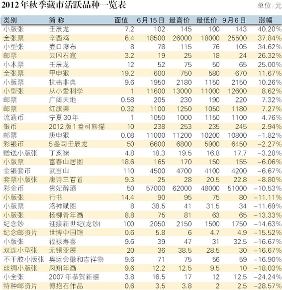 值得留意的是,9月上旬邮市中的近期热点品种又出现回升迹象,其中“壬辰龙”全张票和小版张分别反弹到400元和140元附近。不过,由于这次回升并没有投资者看好,也不存在如反季行情那般的奢望,所以这种看似风平浪静的反弹,也许就会产生石破天惊的结果,因为任何投资市场的行情往往都是在于无声处响惊雷。当藏市缠绵调整了一年之久后,“龙年”的秋季行情会不会出现绝地反击走势,投资者不妨拭目以待。
