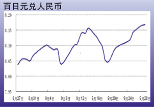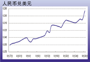 9月24日至29日当周,节前受银行调整美元头寸因素影响,美元抛盘增大,人民币兑美元汇率震荡走高,并创下2005年7月汇改以来的新高,28日美元兑人民币报收6.2841